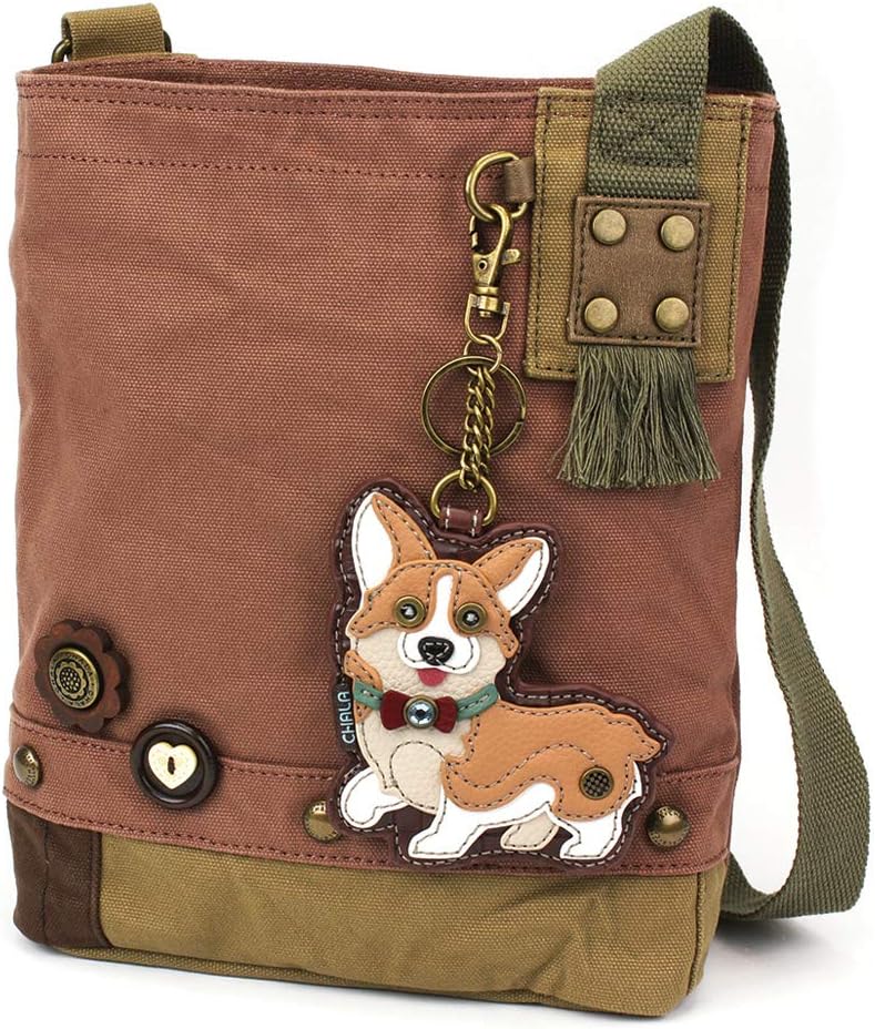 Chala Handbags Patch Cross-body Bag with Corgi Puppy Key-fob / Coin Purse Bundle Metal flower & fun wood buttons Top zip closure Antique brass toned hardware Fully lined One interior zippered pocket Two interior slide pockets Material: Washed canvas cotton, leather, & textured faux leather Approx. measurements: 10"W x 4"D x 11.5"H, Shoulder strap length: adjustable from 13” to 24.75” inch Designed in California