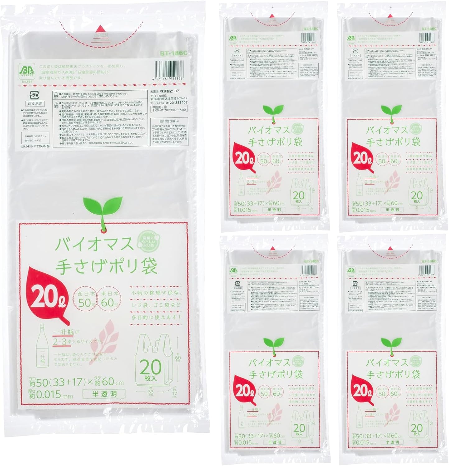 This plastic bag is made of some plant based plastics and is dedicated to reducing greenhouse gas effects, and saving petroleum resources. A plastic bag containing 25% biomass from a plant derived ingredient that can be distributed free at retail stores. Large enough to hold 5 to 6 bottles of 0.3 gal (1 L) of milk East Japan 30, West Japan 40, 2.8 gal (10 L) type Translucent type that allows you to see the contents Can be used for various purposes such as organizing and storing small items, grocery bags, garbage bags, etc. Do not place near heat sources such as gas stoves, ovens, oven stoves, and oven stoves. The bag may melt when it is exposed to high temperature and cannot be used Please note that if you insert items with protrusions may tear over the material. Please note that printing may bleed or fade due to friction, adherence to the printed surface of the bag (floor, wall, other materials), and adhesion (water, oil, etc.) Please do not store in direct sunlight or places with high temperature or humidity. There may be rare cases where discoloration may occur. There may be some smell that may be left in the product due to processing of polyethylene. Please note that if you put items containing water, the gusset part may leak moisture from the main gusset. Please note that when applying pressure to the bag, moisture may leak from the gusset part. Due to the manufacturing process, there may be small cuts in the bottom of the bag, but this will not affect the use of the product. Please note that if the handle is pulled hardly, it may tear it. This product is made of polyethylene, so it does not generate chlorine gases even when burned. When disposing or recycling recovery, please separate it according to the method defined by the municipal regions. ● This bag is a possibility of choking and other hazards for toddlers and children. Keep out of reach of infants and children.