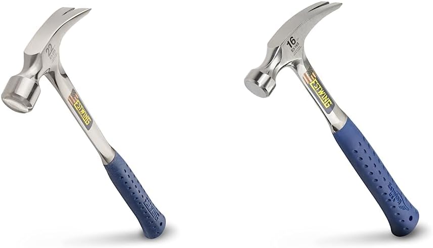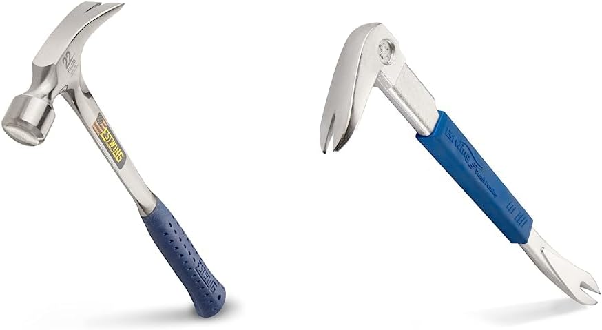 Estwing E3‐22S 22 oz Straight Claw Hammer with Smooth Face & Shock Reduction Grip, SilverEstwing's Solid Steel Framing Hammer's feature a longer handle and larger face resulting in more striking power and increase leverage for pulling and prying nails or boards. The head and handle are forged in one piece for maximum durability and hand polished to a beautiful finish. This hammer features our patented Shock Reduction Grip the most comfortable, durable grip on the market. The Shock Reduction Grip reduces impact vibration by over 70%. It is molded and bonded directly to the tools steel core, meaning it will never slip, even under the harshest conditions. Estwing striking tools are proudly made in Rockford, IL.This smooth-face framing hammer crafted by Estwing offers a forged one piece head and handle of tool steel, fully polished, and a blue nylon-vinyl, deep-cushion grip that's molded on and absorbs all shock. Since 1923, the Estwing family and its employees have taken pride in designing and manufacturing the world's most durable, comfortable and attractive striking and struck tools. All claw hammers, axes, specialty tools and pry bars are manufactured to the highest possible standards and offer a true value to both tradesmen and craftsmen alike.ESTWING Pro Claw Nail Puller - 14" Pry Bar with Forged Steel Construction & No-Slip Cushion Grip - PC360GEstwing’s popular 14 in. Japanese pattern design Pro-claw nail pullers are made with fine tool steel, drop forged and tempered for extra durability. Chrome finish and comfortable blue cushion grip. Both nail puller claws are precise and sharp to remove imbedded or headless nails with ease and minimal wood damage. Shape and rounded head design gives you improved leverage. Precision thin claw design enables you to get into hard to reach places. For use in nail removal right angled for removing embedded and headless nails