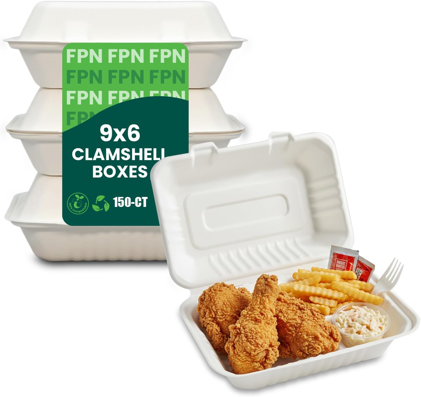 Upgrade your food service with FPN Compostable Clamshell To-Go Containers, the smart choice for businesses that value both quality and sustainability. Made from natural sugarcane bagasse and bamboo fibers, these eco-friendly food containers are sturdy, microwave-safe, and leak-resistant—offering the reliability of traditional packaging without the environmental impact. Perfect for restaurants, catering, food trucks, delis, and meal prep, these disposable carryout containers are versatile enough for hot or cold foods. Each size fits different needs: 9x6 clamshells are ideal for burgers, wraps, and deli sandwiches. 8x8 clamshells work well for pasta dishes, salads, and combo meals. 9x9 clamshells provide the space needed for dinner entrées, BBQ plates, and catering trays. By choosing compostable takeout containers, you’re not only making cleanup easier—you’re also showing your customers that you care about sustainability. Today’s diners notice when businesses make the switch to green packaging, and it can build trust, loyalty, and repeat sales. Available in 75-count and 150-count bulk packs, these eco-friendly carryout boxes deliver strength, value, and a positive impact. 👉 Serve meals with confidence while making a difference—choose FPN Compostable Clamshell Containers for strong, sustainable, and professional food packaging.