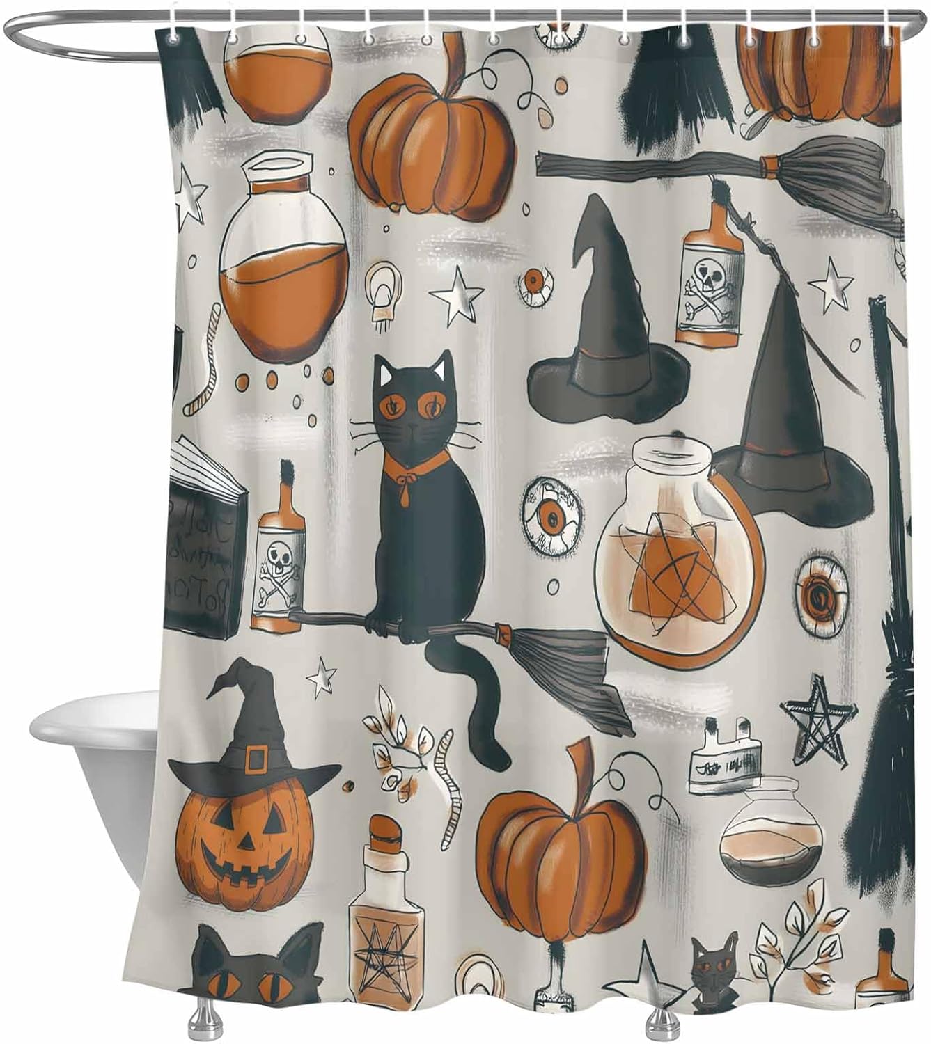 Halloween Shower Curtain, Waterproof Fabric Shower Curtains, Happy Holiday Shower Curtain for Bathroom DecorPackageOur shower curtain set includes 1 shower curtain and plastic hooks.Premium MaterialSoft polyester fabric to touch, lightweight, waterproof, reusable and detail sewing, machine washable. It can prevent the splashing of water from the bathtub during bathing.Fine Stitching HemSew along all edges to prevent tearing, durable throughout long-term use.Grommets for TearproofThe metal grommets promote easier hanging and long-lasting strength. Easy to HangEasy to install and hang, with free hooks, fits most bathrooms.Perfect AdditionEffortlessly add a polished feel to your bathroom with this design-minded shower curtain. Classic style and Halloween patterns to create a chic shower atmosphere.Multi SizeWith a variety of sizes of shower curtain, you can choose the size that suits you according to the actual measurement.Size Dimension:36x72IN=91x183CM36x78IN=91x198CM48x72IN=122x183CM54x78IN=137x198CM60x72IN=152x183CM72x72IN=183x183CM72x78IN=183x198CM72x84IN=183x214CM72x96IN=183x244CMWarm Tip1. Since we use different displayers, the color of the picture you see may be different from what we see.2. We measure include the edge size, the actual you feel maybe a little shorter, but will not affect your using, please understand. The important, the shower curtain leaves away the ground will be better for hygiene.