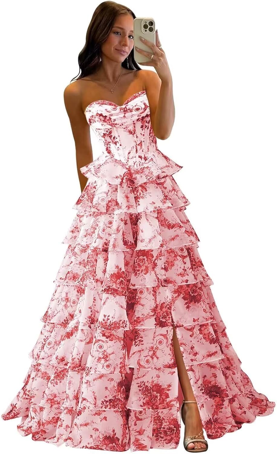 | Embellishment Feature | Floral Print Tiered Prom Dresses 2026 with Slit Long Strapless Corset Formal Evening Party Gowns, Strapless Ruffle Prom Dresses with Slit Tiered Corset Chiffon Cocktail Evening Dress |