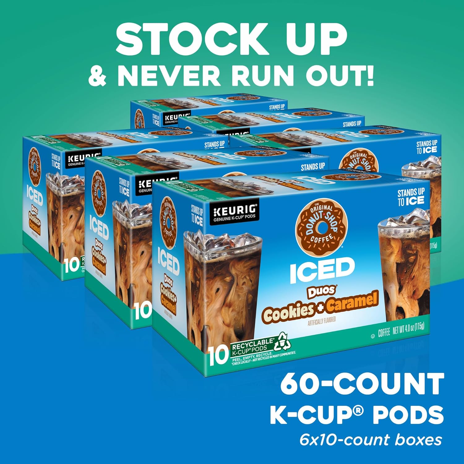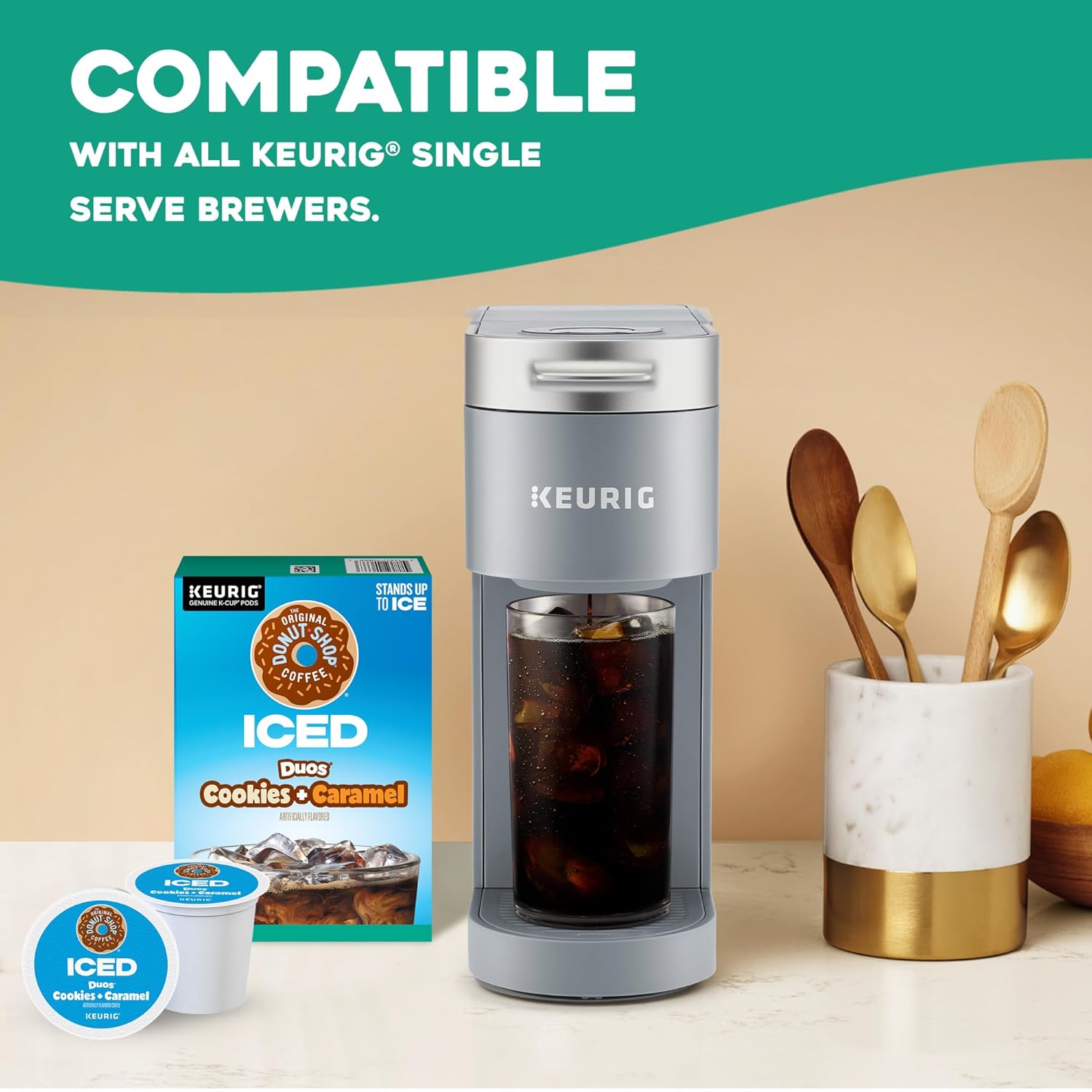 Sweet cookies and gooey caramel flavor are great on their own, but together they’re even better … and a whole lot cooler! The Original Donut Shop® Coffee Iced Duos® Cookies + Caramel coffee blends two flavors that complement each other and the roast of the beans, giving you a uniquely delicious experience in every cup. We blend the fresh-baked flavors of sugar cookies and buttery caramel that come together in a sweet duet of delicious, perfectly roasted harmony that’s chilled to perfection when served over ice. It’s the cookies and “dream” combination come true! These medium roast, caffeinated K-Cup® pods are engineered for guaranteed quality. Each Iced Duos® K-Cup® pod is compatible with any Keurig® single serve coffee maker and designed to stand up to ice. To brew an iced coffee, fill a large tumbler with ice. DO NOT use glass. Brew on the 8 oz size or use the Strong or Iced button, if available, for bigger flavor. Add milk, sweetener, and more ice to taste, if desired, and enjoy! Simple. Delicious. And recyclable*. Enjoy the same great-tasting coffee you know and love, and when you’re done, just peel, empty, and recycle. *Check locally, not recycled in many communities.