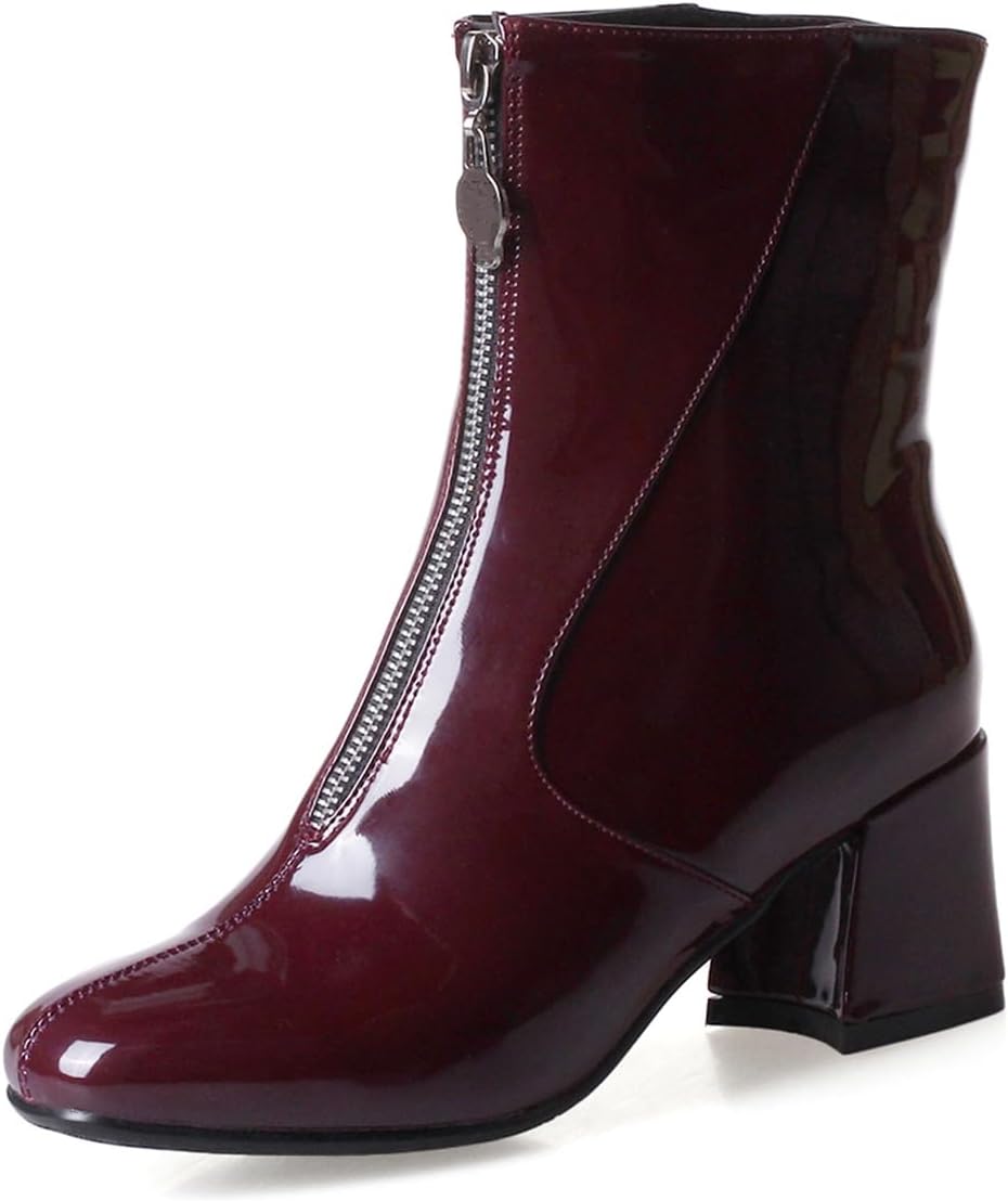 Women's Fashion Chunky Mid Heels Dressy Ankle Boots Round Toe Front Zipper Winter Fall Short BootiesSize Chart:Size 4 US = EU34 = Heel to Toe 22.0cm/8.66"Size 4.5 US = EU34 =Heel to Toe 22.0cm/8.86"Size 5 US = EU35 = Heel to Toe 22.5cm/9.06"Size 5.5 US = EU36 = Heel to Toe 23cm/9.06"Size 6 US = EU37 = Heel to Toe 23.5cm/9.25"Size 6.5 US = EU37 = Heel to Toe 23.5cm/9.25"Size 7 US = EU38 = Heel to Toe 24cm/9.45"Size 7.5 US = EU39 = Heel to Toe 24.5cm/9.65"Size 8 US = EU39 = Heel to Toe 24.5cm/9.65"Size 8.5 US = EU40 = Heel to Toe 25cm/9.84"Size 9 US = EU41 = Heel to Toe 25.5cm/10.04"Size 9.5 US = EU42 = Heel to Toe 26cm/10.24"Size 10 US = EU42 = Heel to Toe 26cm/10.24"Size 10.5 US = EU43 = Heel to Toe 26.5cm/10.43"Size 11 US = EU44 = Heel to Toe 27.0cm/10.63"Use your length and width measurements to find your shoe size on the above size chart. If your foot is fat or wide, please select a bigger size up.PERFECT ITEM FEATURES:☛Item Type: Ankle-boots☛Main Material: High Quality Patent Leather upper; Comfort Velvet Lining; Non-skid Rubber sole.☛Closure_type: Front Zipper☛toe_style: Round-toe☛Heel Height: Heel Height 2.36 inch☛Width: Medium (BM)☛Season: Spring/Autumn/Winter☛Color: Multiple colors optional☛Occasion Lifestyle: Fashion,Classic,Casual.